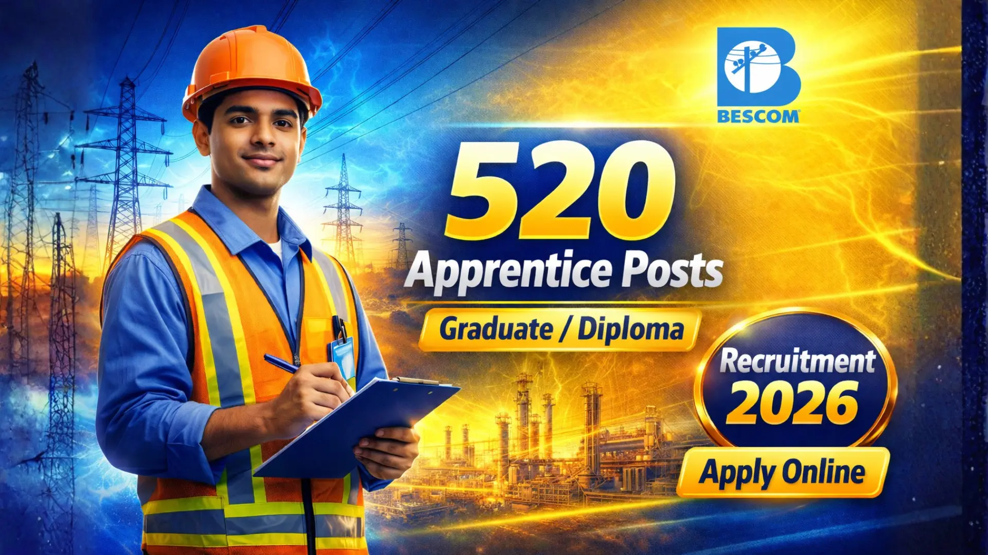 BESCOM Apprentice Recruitment 2026: Bangalore Electricity Supply Company Limited (BESCOM) has released the official Apprentice Training Notification inviting online applications from eligible Graduate & Diploma holders of Karnataka State for undergoing One-Year Apprenticeship Training under the Apprenticeship Act, 1961. A total of 520 apprentice positions have been announced.
