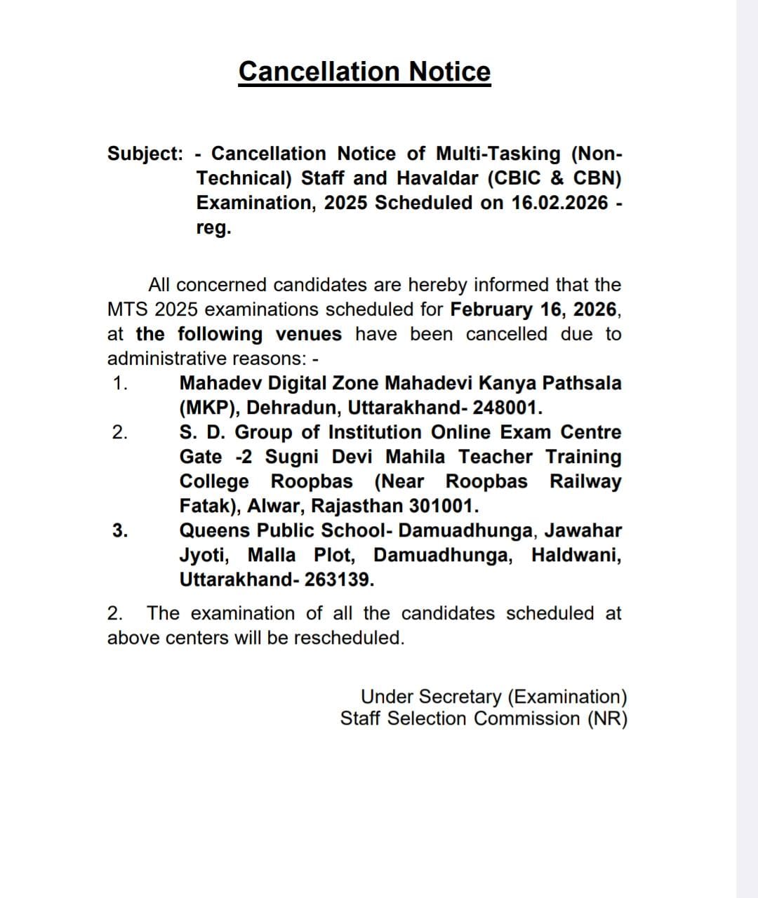 As per the notice, the examination scheduled on 16 February 2026 has been cancelled at specific venues due to administrative reasons. SSC has confirmed that the examination for affected candidates will be rescheduled.