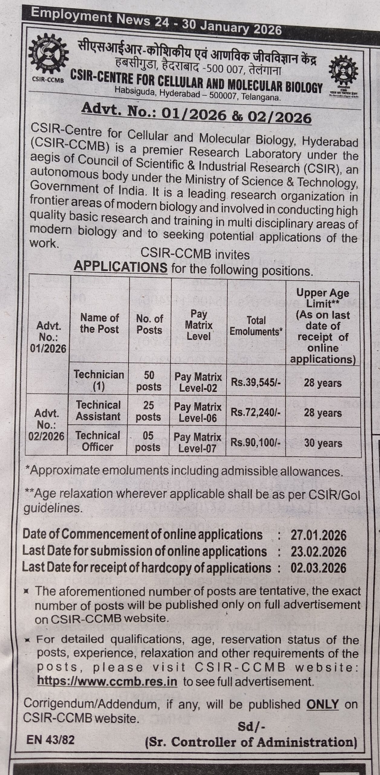 The CSIRβCentre for Cellular and Molecular Biology (CSIR-CCMB), Hyderabad, a premier research laboratory under the Council of Scientific & Industrial Research (CSIR) and the Ministry of Science & Technology, Government of India, has released the official recruitment notification for the year 2026. As per Advertisement No. 01/2026 & 02/2026, applications are invited for Technician, Technical Assistant and Technical Officer posts. Eligible candidates can apply online within the prescribed dates.