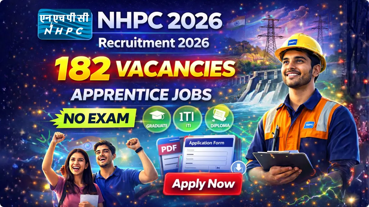 NHPC Apprentice Recruitment 2026: NHPC Limited, a Navratna PSU under the Ministry of Power, has released official notification No. NH/Rectt./01/2026 for engagement of 182 Apprentices in various Graduate, Diploma and ITI trades for one-year training.