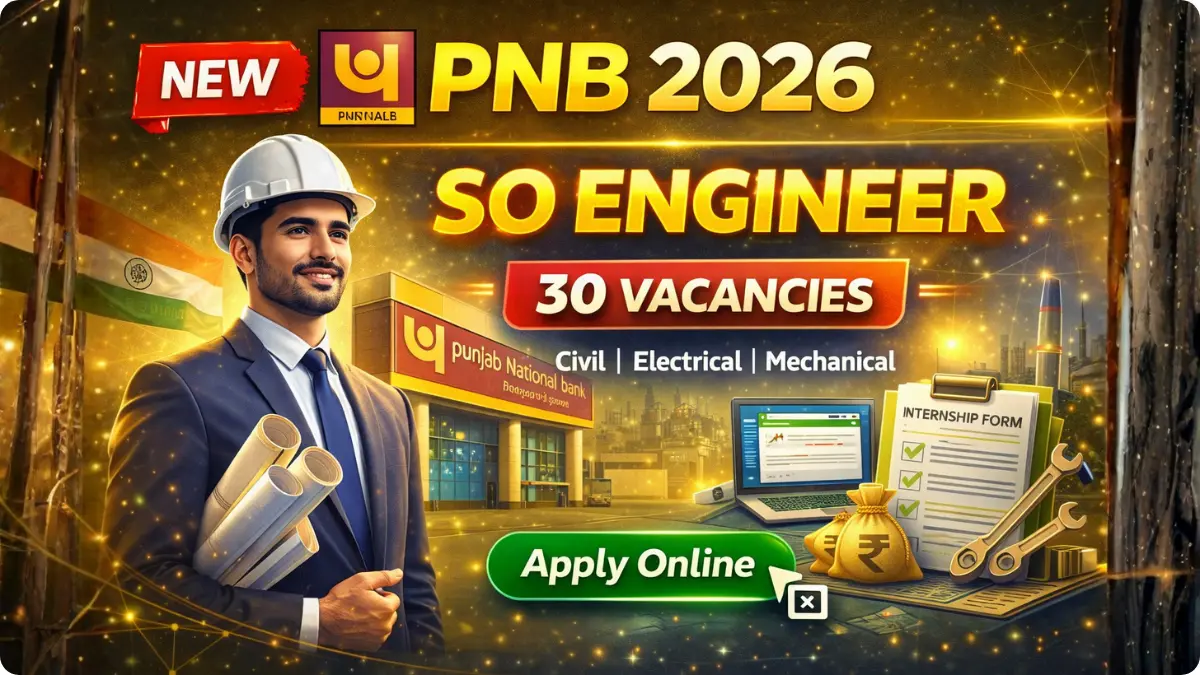 PNB SO Recruitment 2026: Punjab National Bank (PNB) has released the official notification for 30 Specialist Officer (Engineer) posts including Civil, Electrical, and Mechanical disciplines. Interested candidates can apply online from 21 April 2026 to 05 May 2026.