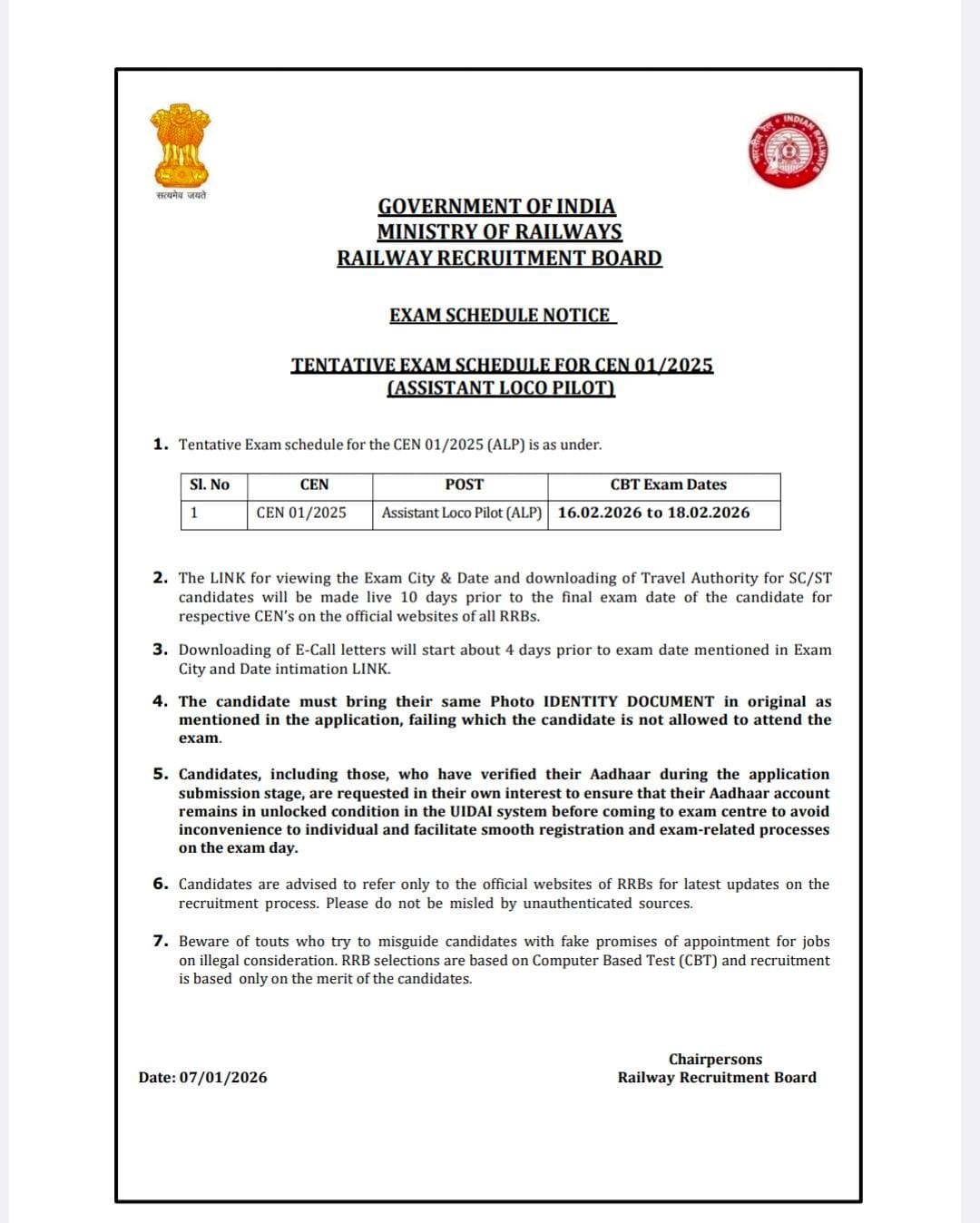 The notification is issued by the Government of India, Ministry of Railways, Railway Recruitment Board and dated 29 January 2026. Candidates are advised to follow only official RRB websites for updates and avoid misleading sources.