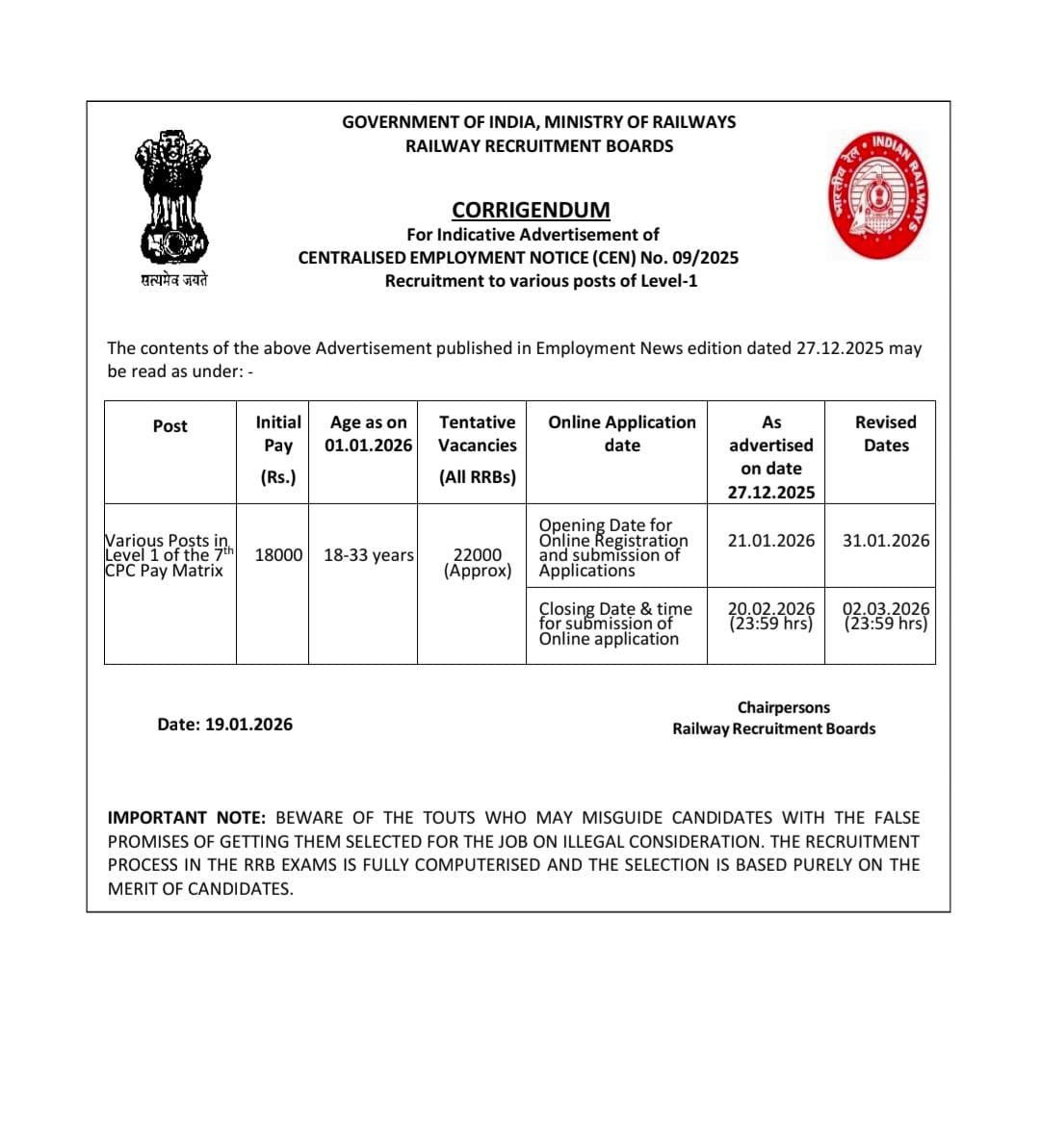 Candidates can check the corrigendum on the official websites of their respective Railway Recruitment Boards (RRBs).