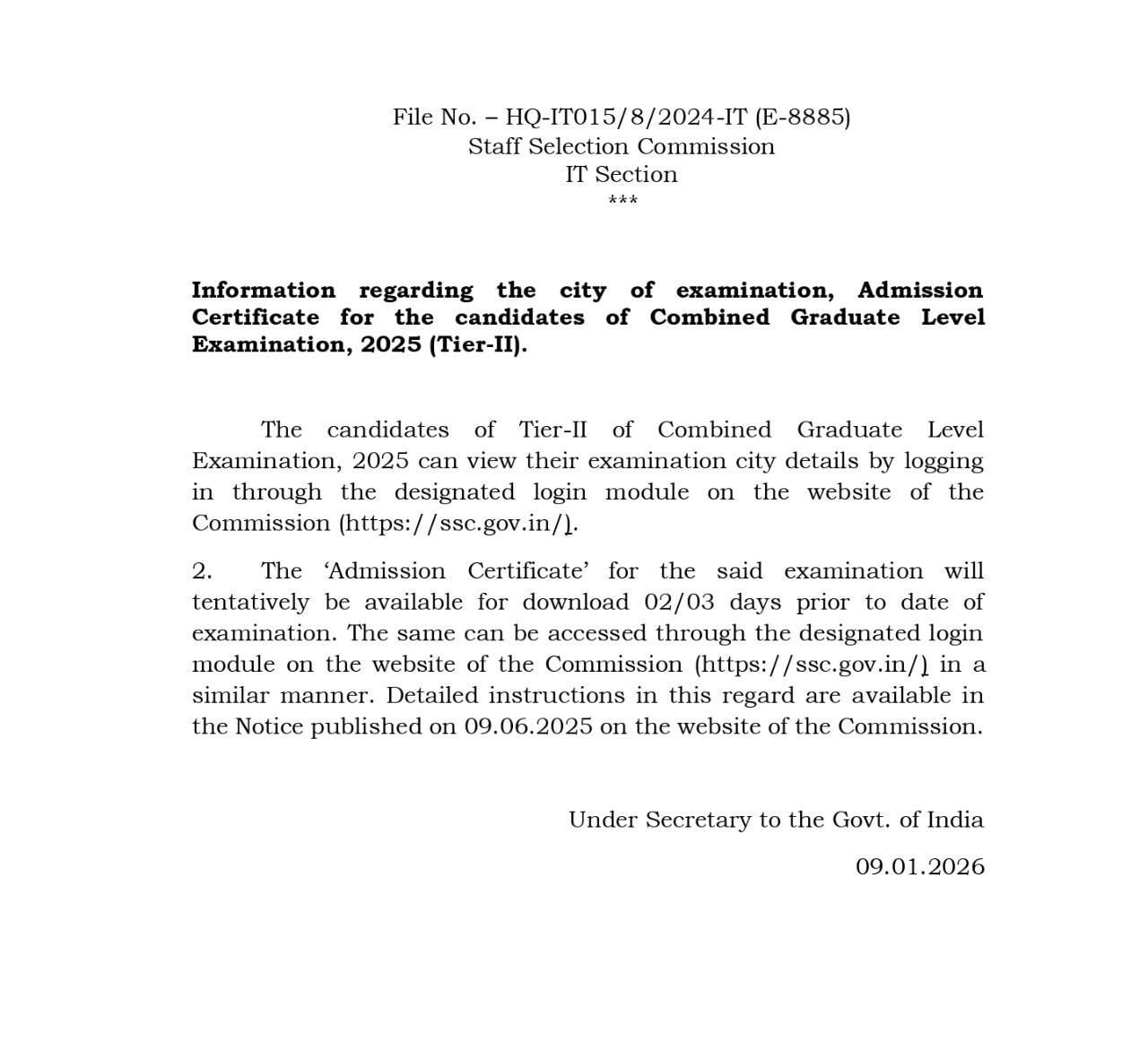 The Staff Selection Commission (SSC) has officially released the City Intimation Slip for the Combined Graduate Level (CGL) Examination 2025 – Tier-II. As per the official notice issued by SSC IT Section dated 09 January 2026, candidates appearing for Tier-II can now check their exam city details by logging into the SSC portal.