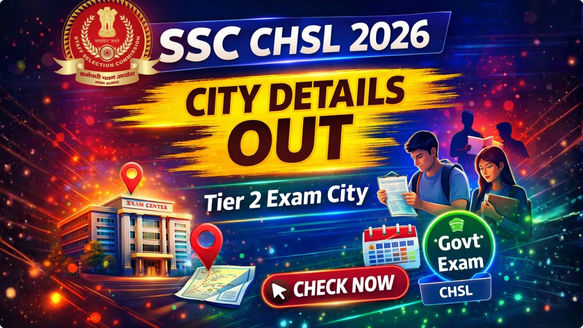 SSC CHSL City Intimation Slip 2026: Staff Selection Commission (SSC) has officially released the SSC CHSL Tier 2 City Intimation Slip 2026. Candidates appearing for the Combined Higher Secondary Level (CHSL) Tier-II Examination can now check their allotted exam city details online.