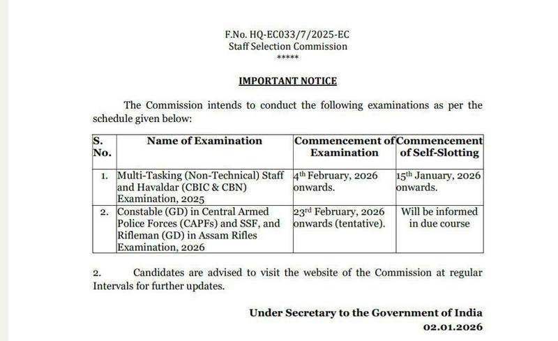 The Staff Selection Commission (SSC) has officially released an important notice regarding the SSC MTS 2025 examination schedule. As per the latest notice, the Multi-Tasking (Non-Technical) Staff and Havaldar (CBIC & CBN) Examination, 2025 will commence from 4th February 2026. Candidates who have applied for SSC MTS & Havaldar 2025 can now check complete exam-related details including eligibility, exam pattern, PET/PST, salary, and important dates below.