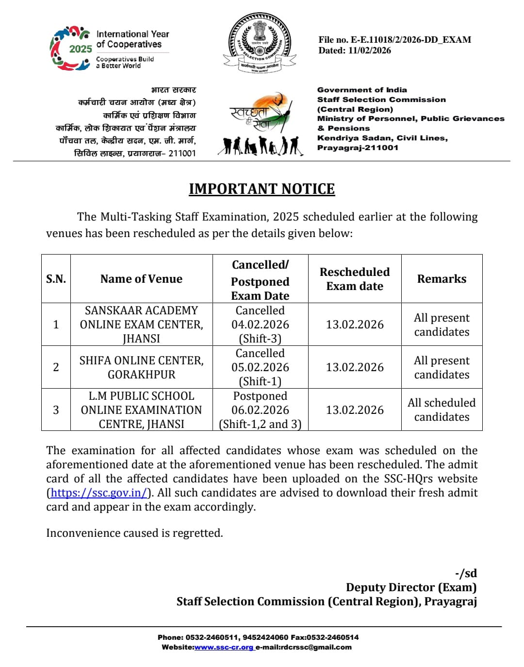 This update is strictly based on the official notice released by SSC. Candidates affected by the venue changes are advised to carefully review the revised exam schedule and download their fresh admit cards.